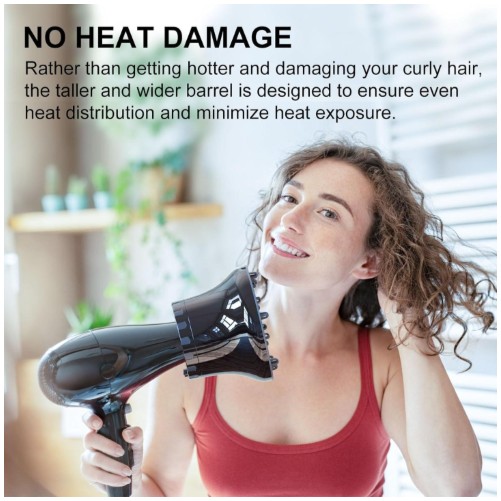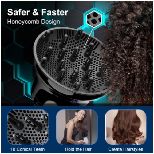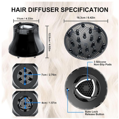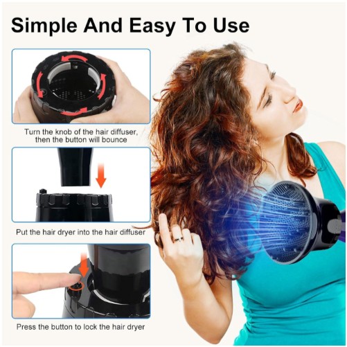 El secador de pelo difusor reduce eficazmente el encrespamiento, agrega volumen, define rizos ondulados y mejora la textura general de tu cabello. Solo gira la parte superior del accesorio del difusor de secador de pelo en sentido antihorario para ampliar la abertura, desliza la boquilla de la secadora en el difusor de cabello y suelta. Desbloquea todo el potencial de tus mechones con nuestro difusor de cabello que cambia el juego. Muestra tus hermosos rizos con la máxima confianza y estilo.
