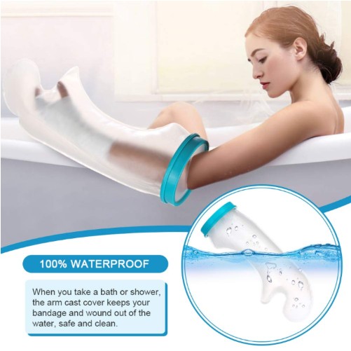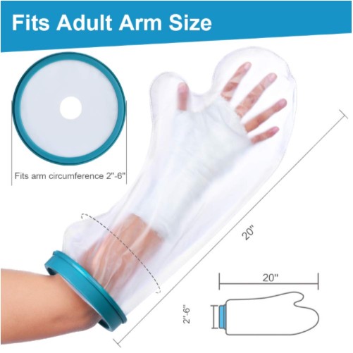 Funda impermeable para brazo corto: la cubierta impermeable del molde del brazo es para la ducha y el baño. Esta funda moldeada mide 20 pulgadas de largo y sube por encima del brazo, lo que la hace ideal para cubrir lesiones de dedos y brazos. Material ligero, higiénico, lavable, no se pega a tu brazo. El orificio de apertura central flexible se estira hasta 6 pulgadas de diámetro, es lo suficientemente ancho como para que tu yeso lo atraviese, pero lo suficientemente apretado como para no permitir que pase el agua.
